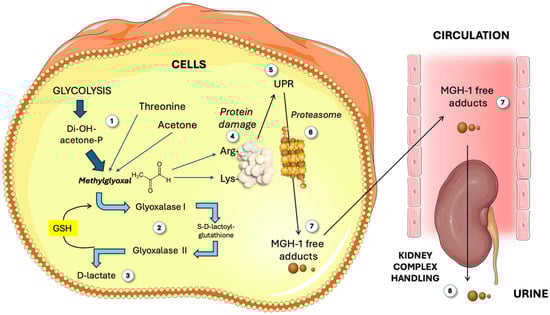 MG modification increases the molecular volume of arginine residues by 18%, making them more hydrophobic. Arginine residues are often found in enzyme catalytic domains, so MG modification can alter protein function [,]. Beyond active sites, there are other structural considerations. Indeed, polar residues like arginine on protein surfaces enhance solubility in the cytosol. MG-H1 formation eliminates its polarity by loss of a positive charge. This affects interactions with the environment, translating into shifts in the secondary structure. Consequently, the increased hydrophobicity due to MG-H1 signals misfolded or damaged proteins, activating the unfolded protein response (UPR). The UPR activates the ubiquitination and degradation of MG-modified proteins via the 26S proteasome [,,], as shown in Figure 1. However, modified amino acids remain unchanged after protein degradation and are cleared from the cell as AGE free adducts. The modified amino acids in circulation, whether from cellular degradation or direct modification of circulating peptides, are excreted by the kidney in a complex management process, as depicted in Figure 1 [].