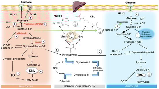 The human glyoxalase family of proteins includes six members with significant variations in enzymatic activity, protein structure, and tissue specificity [,,]. This family is primarily involved in detoxifying reactive dicarbonyls, of which methylglyoxal (MG) is the most significant. Due to their central role, these highly conserved enzymes are important for maintaining homeostasis and preventing the development of metabolic diseases like diabetes and cancer [,,,,,,,]. MG is traditionally associated with glycolysis and serves as an indicator of unbalanced flux between dihydroxyacetone phosphate (DHAP) and glyceraldehyde-3-phosphate (G3P). MG stems from a metabolic node, the trioses, shared with gluconeogenesis and glycerogenesis [,,,,,,]. The latter ultimately contributes to triacylglycerol (TG) synthesis. Due to its protein-modifying abilities, MG has been implicated in obesity and insulin resistance (IR), prompting the development of activators that enhance the expression of glyoxalase 1 (GLO1), its primary catabolic enzyme [,]. Although the initial results are modest, early trials have demonstrated the potential utility of targeting the glyoxalase pathway for managing the increasing prevalence of metabolic syndrome, obesity, and diabetes. The literature primarily focuses on glycolysis in a somewhat non-specific way, as a source of MG, often overlooking the liver’s central role in MG metabolism. We present an alternative perspective on this significant topic by highlighting two areas that warrant further research. Firstly, the metabolism of fructose should be considered an important source of MG. It involves three distinct enzymes different from those in glycolysis and is poorly regulated by feedback mechanisms and thus prone to overflow. We examine how fructose metabolism may be the primary source of MG in the liver, due to frequent fructose surges provided by the Western diet and the fact that over 80% of fructose metabolism occurs in the liver during first-pass uptake. These points support ongoing efforts to identify safe and effective methods to stimulate the glyoxalase pathway to mitigate the harmful effects of fructose metabolism that contribute to IR and its associated consequences. Thus, this article will provide an overview of methylglyoxal (MG) metabolism and glyoxalases and will then focus on key aspects of fructose metabolism in relation to IR and its associated conditions, including dyslipidemia, diabetes, and cardiovascular disease (CVD). Subsequently, we will examine hepatic glucose and fructose metabolism in parallel, to highlight their differences as well as their intricate and synergic interactions. We present our evidence suggesting that MG metabolism (with D-lactate measurement as a proxy) can be influenced by fructose restriction, suggesting that activation of glyoxalase may be beneficial in situations where dietary fructose reduction is not feasible.
