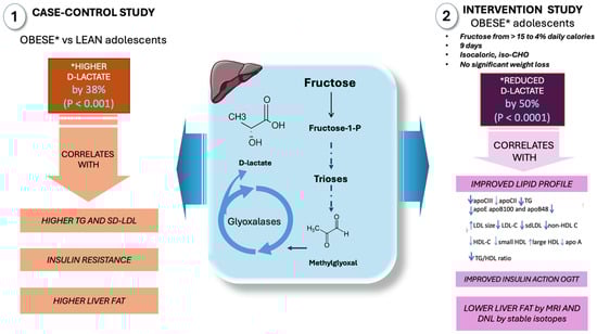 As previously mentioned, there is a paucity of studies of MG levels in obesity, MetS, or IR due to the lack of a reliable assay, complex LC-MS/MS methods, and scarce high-purity MG standards. Nevertheless, one indirect measure of MG flow is plasma D-lactate levels, which reflect essentially the end metabolite of MG in vivo. Adult obesity has been linked to elevated serum MG and D-lactate levels. Nevertheless, neither this phenomenon nor the connection between these pathways, fructose metabolism, and childhood obesity has been studied. To shed light on these issues, we conducted a case–control study and an intervention study in teenagers, which we summarize in Figure 4.