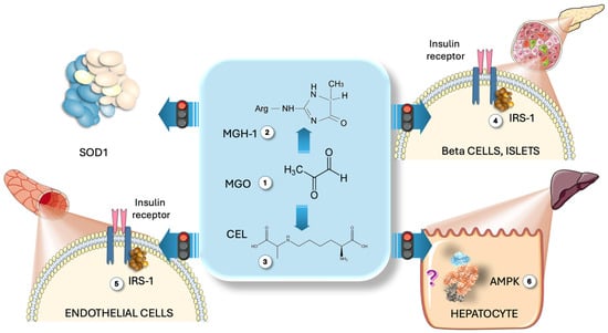 MG is known to predict diabetic complications, including neuropathy, nephropathy, and retinopathy. Cell culture and animal models, including those of our group, suggest MG drives systemic metabolic dysfunction, contributing to diabetes development [,,,,,,]. Nonetheless, in humans, data on MG levels in obesity and their link to IR are limited, partly due to the absence of a reliable commercial assay for MG, the complexity of the LC-MS/MS methodology, and the lack of high-purity MG standards. Although current evidence is limited, data suggest MG accumulation may drive obesity-related metabolic dysfunction. For instance, plasma MG levels are ~37% higher in overweight individuals and ~85% higher in obese participants [,,,]. The exact mechanism, primary affected tissues, and responsible factors are unknown. Little attention has been paid to the liver in these matters; we will bring this issue to the limelight.