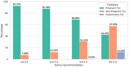 In our study, no hydrometra cases were observed after the first or second synchronization cycle. However, prevalence rose to 0.51% following the third treatment and escalated dramatically to 12.33% after the fourth cycle (p < 0.0001). Notably, these synchronization rounds occurred within a relatively brief average interval of 7.22 ± 1.64 months. These data strongly suggest that repeated hormonal stimulation over short periods can compromise uterine physiology, likely through disruption of luteolysis and sustained progesterone exposure [11,87,88]. Chronic progesterone elevation may reduce uterine contractility and impair the elimination of uterine secretions, resulting in intrauterine fluid accumulation and infertility.