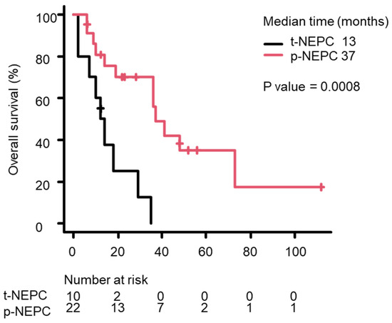 The Kaplan–Meier survival curves for OS after the NEPC diagnosis in the p-NEPC (red line) and p-NEPC (black line) groups. Median OS was 37 months in the p-NEPC group vs. 13 months in the t-NEPC group (p = 0.0008, log rank test).