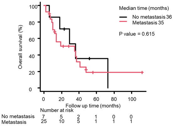 The Kaplan–Meier survival curves for OS after the NEPC diagnosis in patients with (red line) and without distant metastasis (black line) groups. Median OS was 35 months in patients with metastasis vs. 36 months in patients without metastasis (p = 0.615, log rank test).