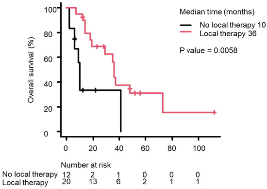 Based on Kaplan–Meier survival curves, median OS from the NEPC diagnosis differed significantly between the p-NEPC and t-NEPC groups, with it being longer in the p-NEPC group than in the t-NEPC group (37 months vs. 13 months; p = 0.0008) (Figure 1). Median OS tended to be shorter in patients with distant metastasis at NEPC diagnosis than in those without distant metastasis, but this difference was not significant (36 months vs. 35 months; p = 0.615, Figure 2). Median OS was significantly longer in patients receiving local therapy—including radical prostatectomy or prostate-directed radiotherapy—than in patients who did not receive local therapy (36 months vs. 10 months; p = 0.0058, Figure 3). The Kaplan–Meier method allows for a simple evaluation even with a small amount of data. However, because of the small number of cases in this study, this result is not definite.