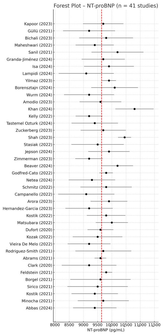 The forest plot in Figure 2 summarizes the NT-proBNP values across all 41 studies, illustrating both individual and pooled estimates.