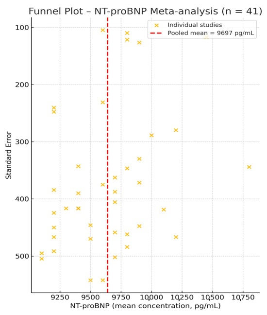 Funnel plot for the 41 studies reporting NT-proBNP concentrations [1,2,8,9,16,17,18,19,20,21,22,23,24,25,26,27,28,29,30,31,32,33,34,35,36,37,38,39,40,41,42,43,44,45,46,47,48,49,50,51,52]. The red dashed line marks the pooled mean of 9697 pg/mL. The symmetrical spread of studies around this central estimate suggests an absence of significant publication bias.