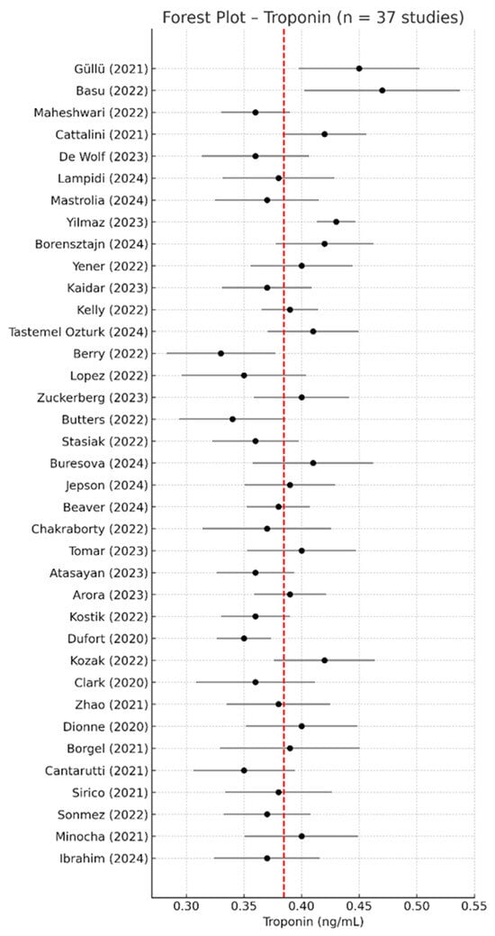 Forest plot of serum troponin concentrations across the 37 studies included in the meta-analysis [2,9,17,19,23,24,25,29,30,31,33,34,36,41,43,45,49,51,53,54,55,56,57,58,59,60,61,62,63,64,65,66,67,68,69,70,71]. Most point estimates were clustered below 0.5 ng/mL, with overlapping confidence intervals and minimal variation across cohorts. The red dashed line indicates the overall pooled mean concentration from the meta-analysis.