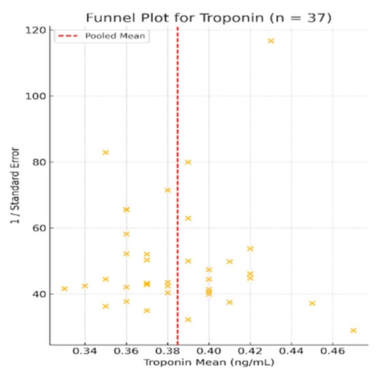 Funnel plot for studies included in the meta-analysis of troponin levels (n = 37) [2,9,17,19,23,24,25,29,30,31,33,34,36,41,43,45,49,51,53,54,55,56,57,58,59,60,61,62,63,64,65,66,67,68,69,70,71]. The plot shows a symmetrical distribution of studies around the pooled mean, indicating no substantial publication bias. Studies were evenly scattered across the range of standard errors, further supporting the robustness of the findings.