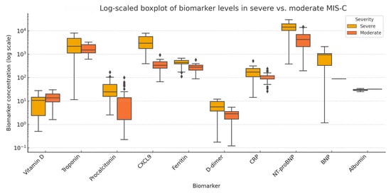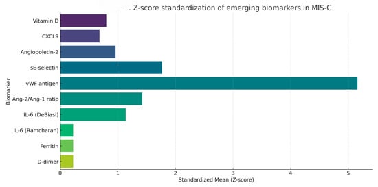 Due to the limited number of studies per biomarker, meta-analysis was not feasible. However, this method enables the comparison of biomarkers with widely different units by normalizing values on a logarithmic scale. The highest magnitudes were observed for sE-selectin (log10 = 5.12) and angiopoietin-2 (log10 = 3.81), suggesting robust endothelial activation in severe MIS-C. In contrast, lower log-transformed levels were noted for vitamin D (0.98) and D-dimer (0.90), with the Ang-2/Ang-1 ratio showing minimal absolute values (log10 = 0.05). These findings underscore the systemic and multimodal nature of MIS-C, reflecting concurrent vascular injury, immune dysregulation, and inflammatory stress. Future prospective studies should validate these biomarkers for use in risk stratification and personalized management of MIS-C.
