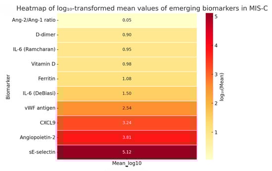 Logarithmic heatmap of emerging biomarkers in MIS-C showing differences in biological magnitude and systemic distribution. This visualization highlights the wide dynamic range and systemic involvement of various biological pathways. Notably, sE-selectin and angiopoietin-2 showed the highest magnitudes, consistent with pronounced endothelial activation. In contrast, vitamin D and D-dimer levels were markedly lower. This multimodal distribution underscores the multisystemic pathophysiology of MIS-C, reinforcing the importance of a biomarker panel approach for risk stratification and disease monitoring.