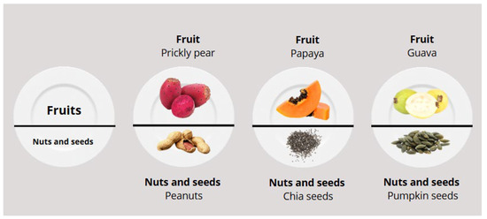 Figure 2 shows the remaining food groups as snacks, and the main part of this meal contains fruits, which are complemented with seeds and nuts. Both groups use groups from the region.