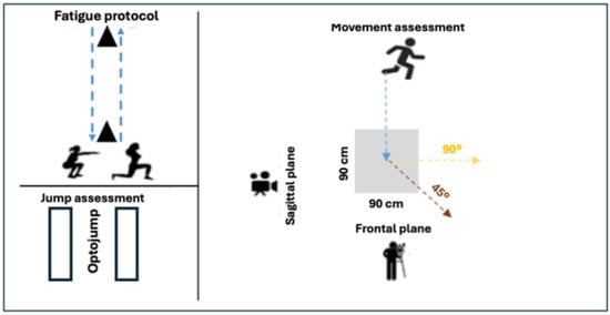 Testing layout representing the fatigue protocol, jump assessment, movement assessment and camera positioning.
