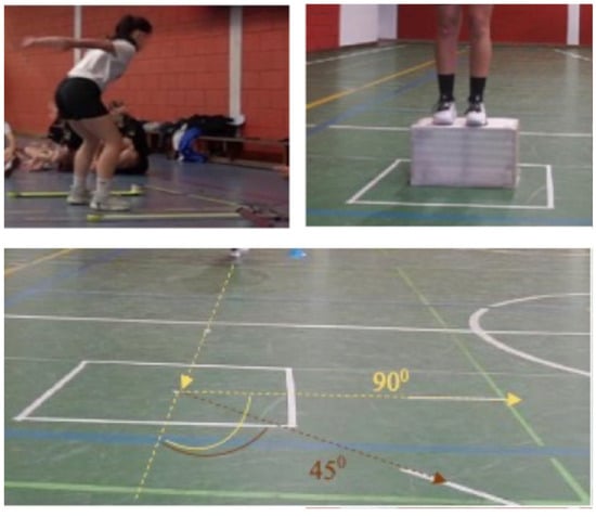 Optojump (CMJ free arms), one leg drop jump (DJ-SL) 30 cm, and changes of direction (90° and 45°) (upper left, right and bottom panels, respectively).