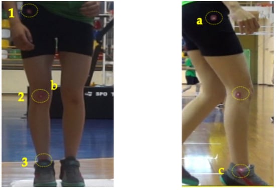 For FPPA analysis, reflective markers were placed on anatomical landmarks, namely the anterior superior iliac spine (ASIS), the center of the patella (knee), and the midpoint between the medial and lateral malleolus (ankle) (Figure 4). For sagittal plane knee angle analysis, markers were placed on the greater trochanter of the femur (hip joint), femorotibial joint space (knee), and tibial lateral malleolus (ankle) (Figure 4).