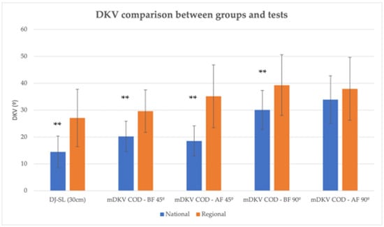 Table 2 presents a comparison between the National and Regional groups, highlighting differences between the groups in the selected variables. Differences were observed in the DKV measured in the DJ-SL test (p = 0.000), in the 45° COD before and after fatigue (p = 0.000), in the 90° COD before the fatigue protocol (p = 0.008), in the maximum power achieved during the RAST test (p = 0.003), and in the fatigue index during the RAST test (p = 0.000). Although no differences were found in DKV after the fatigue protocol or in the 90° COD, it was observed that valgus values were lower in the National group than in the Regional group (Figure 5). In the RAST test, maximum power was significantly higher in the National group, with a significant difference and a large effect size (d > 0.8). Although the minimum power did not present significant differences, it was also higher in the National group. Additionally, the National group demonstrated a higher fatigue index in this test, while a lower fatigue index was observed in the Regional group (p = 0.000).