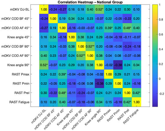 Pearson correlation heatmap for the National group results on the different tests and variables analyzed, statistically significant differences * p < 0.05, ** p < 0.01. Legend: mDKV DJ-SL—maximum dynamic knee valgus during the single leg drop jump (30 cm); mDKV COD—BF 45°—maximum dynamic knee valgus during the execution of the 45° COD before fatigue induction protocol; mDKV COD—AF 45°—maximum dynamic knee valgus during the execution of the 45° COD after fatigue induction protocol; knee angle 45°—relative knee angle at DKV during the execution of the 45° COD; mDKV COD—BF 90°—maximum dynamic knee valgus during the execution of the 90° COD before fatigue induction protocol; mDKV COD—AF 90°—maximum dynamic knee valgus during the execution of the 90° COD after fatigue induction protocol; knee angle 90°—relative knee angle at maximum DKV during the execution of the 90° COD; RAST Pmax—maximum power in the RAST test; RAST Pmin—minimum power in the RAST test; RAST fatigue—fatigue index during the RAST test; CMJ FREE ARMS PF—percentage reduction in flight time during the countermovement jump test with free arm movement after the fatigue induction protocol.