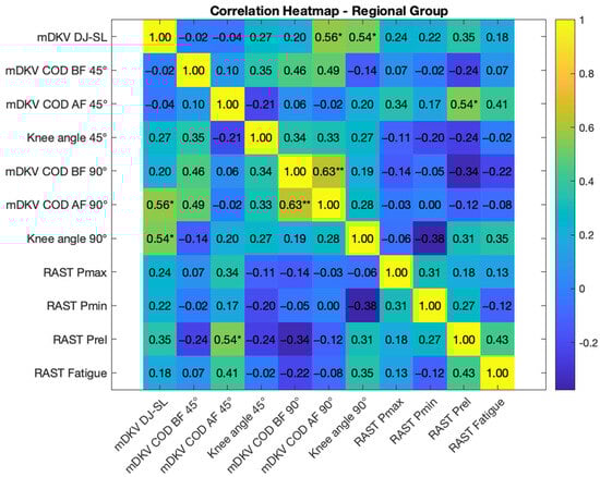 Pearson correlation heatmap for the Regional group results on the different tests and variables analyzed, statistically significant differences * p < 0.05, ** p < 0.01. Legend: mDKV DJ-SL—maximum dynamic knee valgus during the single leg drop jump (30 cm); mDKV COD—BF 45°—maximum dynamic knee valgus during the execution of the 45° COD before fatigue induction protocol; mDKV COD—AF 45°—maximum dynamic knee valgus during the execution of the 45° COD after fatigue induction protocol; knee angle 45°—relative knee angle at DKV during the execution of the 45° COD; mDKV COD—BF 90°—maximum dynamic knee valgus during the execution of the 90° COD before fatigue induction protocol; mDKV COD—AF 90°—maximum dynamic knee valgus during the execution of the 90° COD after fatigue induction protocol; knee angle 90°—relative knee angle at maximum DKV during the execution of the 90° COD; RAST Pmax—maximum power in the RAST test; RAST Pmin—minimum power in the RAST test; RAST fatigue—fatigue index during the RAST test; CMJ FREE ARMS PF—percentage reduction in flight time during the countermovement jump test with free arm movement after the fatigue induction protocol.
