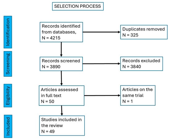 A total of 4215 papers were found and, after excluding duplicates, 3890 papers were left. We excluded reviews and were left with 1560 papers. Then, we excluded research on cell cultures and animal models, research on insertional tendinopathy, studies on Achilles tendinopathy as a manifestation of an inflammatory rheumatic or general disease (rheumatoid arthritis, spondilarthropathies, gout, etc.) and partial or total rupture of the tendon. There remained 50 papers to be screened in full text. We identified two papers referring to the same trial, so we mentioned them together, as a single source.