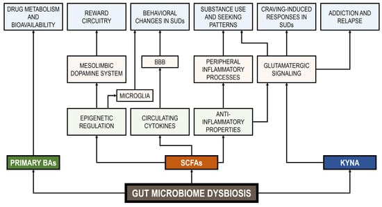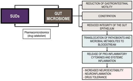 Substance use exerts a direct neurobiological effect and triggers different behavioral responses that can be directly or indirectly modulated by various host systems such as the endocrine system [5,6], the immune system [7], and the gut microbiome (GM) [8,9]. A multitude of mechanisms and pathways have been postulated through which SUDs can influence the diversity and composition of the GM including dietary habits, xenobiotic effects of the drugs, and alteration of the neural regulation of gut motility [10,11,12,13].