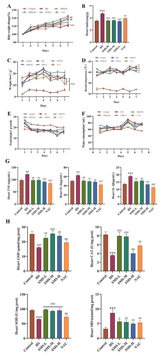 Intervention effects of Sheng Mai San on heat-stressed rats. (A) Body weight change rate; (B) Cardiac index; (C) Body weight loss; (D) Rectal temperature; (E) Food intake; (F) Water intake; (G) Effects of Sheng Mai San on the levels of TNF-α, IL-6, and IL-1β in the hearts of heat-stressed rats; (H) Effects of Sheng Mai San on the levels of GSH, CAT, SOD, and MDA in the hearts of heat-stressed rats. Compared with the control group, ** p < 0.01, *** p < 0.001; compared with the HS group, # p < 0.05, ## p < 0.01, ### p < 0.001, (n ≥ 5/group); “ns” indicates no statistically significant difference (p > 0.05).
