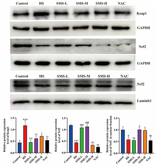 Effects of Sheng Mai San on the Keap1-Nrf2 pathway in the hearts of heat-stressed rats. Compared with the control group, * p < 0.05, *** p < 0.001; compared with the HS group, # p < 0.05, ## p < 0.01, ### p < 0.001, (n ≥ 3/group); “ns” indicates no statistically significant difference (p > 0.05).