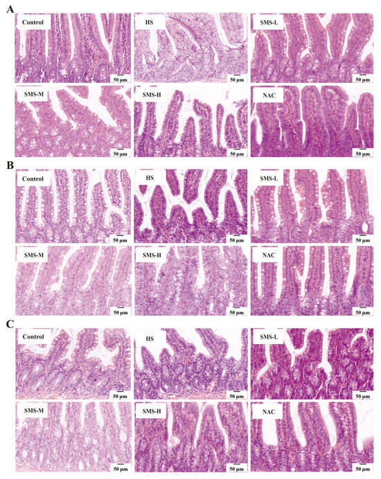 Effects of Sheng Mai San on pathological changes in the small intestine of heat-stressed rats (×400). (A) HE staining of duodenal pathology; (B) HE staining of jejunal pathology; (C) HE staining of ileal pathology (n ≥ 3/group).