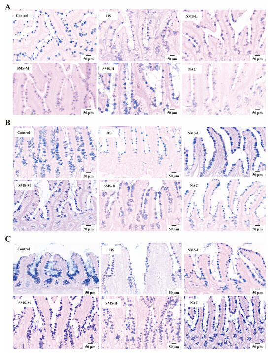 Effect of Sheng Mai San on Goblet Cell Populations in the Small Intestine of Heat-Stressed Rats. (A) Alterations in duodenal goblet cell density; (B) Variations in jejunal goblet cell counts; (C) Modifications in ileal goblet cell abundance (n ≥ 3/group).