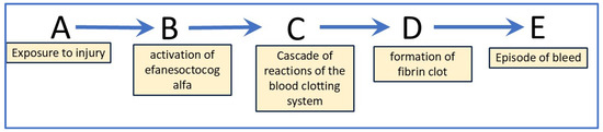 Causal chain representing the formation of a blood clot in study participants who have been administered Altuvoct. Letters A to E: A—exposure to insult or injury, B—activation of efanesoctocog alfa (the active substance of Altuvoct), C—cascade of reactions of the blood-clotting system, D—formation of fibrin clot, and E—episode of bleeding, (i) where B, C and D are mediators for the effect of A on E and (ii) where E is the target quantity that can be measured.