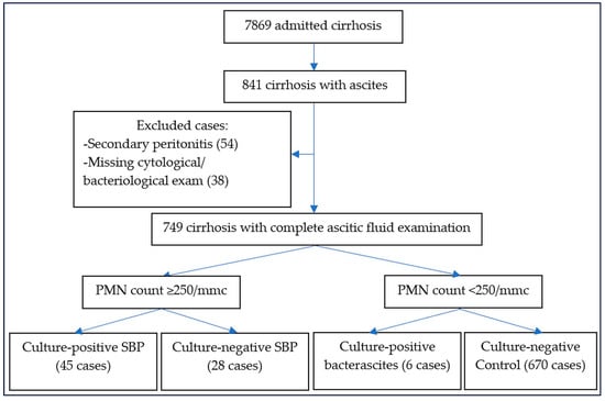 We performed a retrospective study that included patients with culture-positive SBP admitted to the Emergency Clinical Hospital Craiova over 7 years (2018–2024). The study was approved by the Local Institutional Ethics Committee (protocol 10580/7 March 2025). All cirrhotic patients admitted to our hospital were analyzed, and patients with diagnostic paracentesis were initially selected. The diagnosis of ascitic fluid infection was confirmed by a positive culture obtained by inoculation on a dedicated culture medium. Patients with recent surgical intervention or peritoneal dialysis were excluded from the study. Cases with positive bacteriologic examination and neutrophil count above 250/mm3 were diagnosed as culture-positive SBP, whereas those with a positive culture and neutrophil count below 250/mm3 were designated as bacterascitis and included in the bacteriological analysis [1]; patients with negative cultures were diagnosed as culture-negative SBP (Figure 1). Because only one case of healthcare-associated SBP and one healthcare-associated bacterascitis were found, we divided SBP into non-nosocomial (paracentesis was performed less than 48 h after admission) and nosocomial (paracentesis after 48 h).