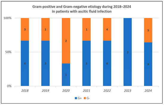- Pimentel, R.; Leitão, J.; Gregório, C.; Santos, L.; Carvalho, A.; Figueiredo, P. Spontaneous Bacterial Peritonitis in Cirrhotic Patients: A Shift in the Microbial Pattern? A Retrospective Analysis. GE Port. J. Gastroenterol. 2021, 29, 256–266. [Google Scholar] [CrossRef] [PubMed]
