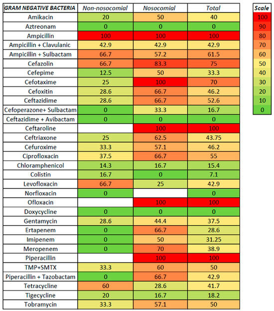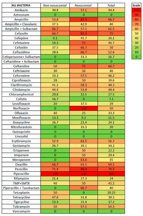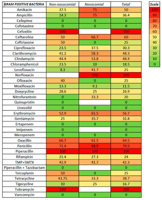 For non-nosocomial infections, high susceptibility was noted for aztreonam, linezolid, carbapenems, piperacillin with tazobactam, and vancomycin (no resistance), followed by cefepime (9.1%), moxifloxacin and tigecycline (both with 13.3%), and cefotaxime (14.3%); no resistance was also noted for cefoperazone with sulbactam, ceftazidime with avibactam, nitrofurantoin, and quinupristin, although only a few strains were tested. Higher resistance was recorded for ampicillin (with or without sulbactam), ceftaroline, erythromycin, cefazolin, and oxacillin. For nosocomial infections, a low rate of resistance was noted for linezolid, aztreonam, colistin, and vancomycin (100% susceptibility), moxifloxacin (9.1%), chloramphenicol (12.5%), and tigecycline (21.3%); no resistance was also noted for two strains tested for ceftazidime with avibactam. Resistance rates of 50% or higher were noted for ceftriaxone, ciprofloxacin, imipenem, and trimethoprim with sulfamethoxazole (50%), clindamycin (53.8%), amikacin, ampicillin with sulbactam, cefuroxime, and tobramycin (57.1%), clarithromycin (58.3%), cefoxitin, ceftazidime, erythromycin, oxacillin, piperacillin with tazobactam, and meropenem (between 61–70%), cefotaxime and ceftaroline (75%), and cefazolin (83.3%). It is worth mentioning that, for some antibiotics, only specific bacteria were tested, such as vancomycin, clarithromycin, clindamycin, linezolid, and erythromycin for Gram-positive bacteria. In contrast, aztreonam, ampicillin + sulbactam, cefazolin, ceftazidime, cefoperazone + sulbactam, ceftazidime + avibactam, cefuroxime, and colistin were tested only for Gram-negative bacteria.
