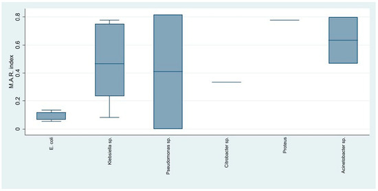 The assessment of overall resistance using the multiple antibiotic resistance index in Gram-negative bacteria showed that Acinetobacter spp. and Klebsiella spp. had the highest resistance, followed by Pseudomonas spp., which also had a great variability, as some strains showed almost no resistance and others had very high resistance. E. coli presented the highest antibiotic susceptibility (Figure 6).