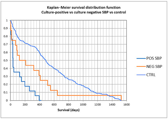 Kaplan–Meier curve in culture-positive, culture-negative spontaneous bacterial peritonitis, and control patients.
