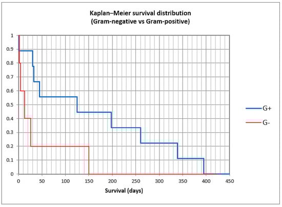 We constructed Kaplan–Meier curves for culture-positive versus culture-negative SBP versus control, and for Gram-positive versus Gram-negative bacteria (Figure 7 and Figure 8). Mean survival was 101 days for culture-positive SBP (95% CI 41.3–160.4 days), 311 days for culture-negative SBP (120.5–501.9), and 550 days for the control group (502.6–599.2), with statistical significance (log-rank p < 0.0001). For Gram-positive SBP, the mean survival was 158 days (62.8–254.1), while for Gram-negative SBP, the mean survival was 39 days (0–94), also with statistical significance (log-rank p = 0.037). These findings suggest that the long-term survival for culture-positive SBP was lower than for culture-negative SBP and the control group, and also that the long-term survival for Gram-negative SBP was lower than for Gram-positive SBP.
