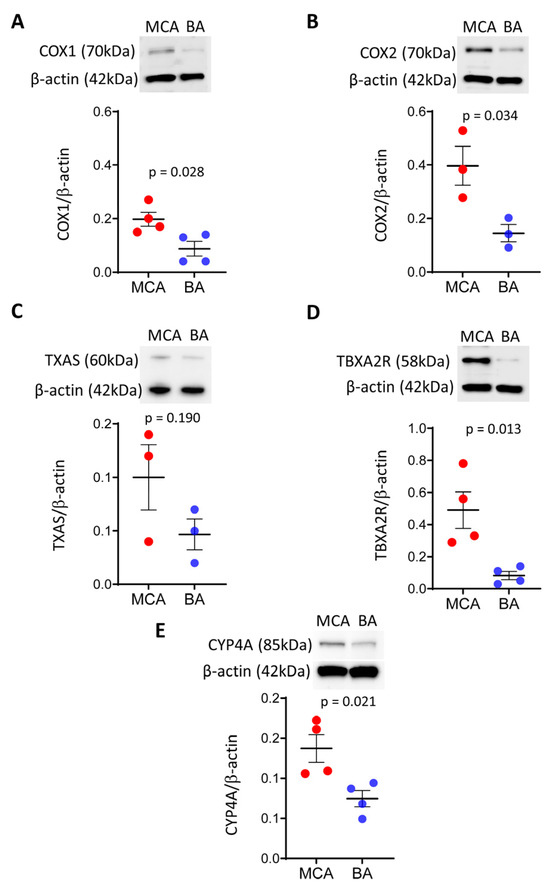- Protein level of thromboxane A2 synthase is similar, whereas the thromboxane A2 receptor is lower in BA than in MCA arteries