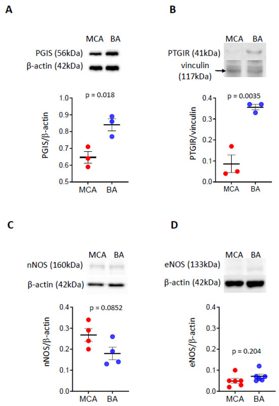 In the present study, we found that the levels of PGIS enzyme (producing PGI2) and PTGIR receptor were significantly higher in the BA compared to MCA (Figure 2A,B); however, we did not find difference in the levels of nNOS and eNOS in the MCA and BA (Figure 2C,D).