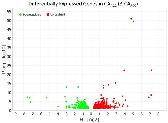 The DESeq analysis revealed that 959 genes had significantly different expression (adj p < 0.05) in CAACC relative to CAPCC. Ingenuity Pathway Analysis (IPA) was used to assess the functional enrichment analysis of genes, which included 636 genes (362 upregulated, 274 downregulated) that were differentially expressed (DEGs) in CAACC relative to CAPCC (Figure 3).