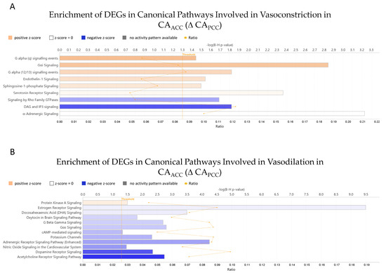Ingenuity pathway analysis (IPA) of differentially expressed genes of canonical pathways involved in vasoconstriction (A) and vasodilation (B) in CAACC relative to CAPCC. Selected canonical pathways are grouped by their proposed effect on vascular tone regulation and presented accordingly. Adjusted p-values of pathway enrichment are visualized on a −(lg) scale, where the values above 1.3 equal the threshold of significance below 0.05. The ratio value is calculated by dividing the number of DEGs mapped to the pathway by the number of all the genes present on the given canonical pathway. The coloring of the bars represents the predicted activity of the canonical pathways calculated as Z-scores. DEGs—differentially expressed genes; CAACC—cerebral arteries of the anterior cerebral circulation; CAPCC—cerebral arteries of the posterior cerebral circulation.