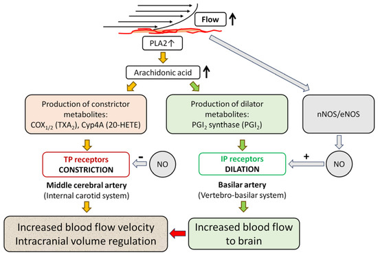 Sensing flow is an important feature of vessels, which was investigated in great depth by several investigators [8,9,12,55,60,61,62,63,64,65]. These studies revealed that the signaling of flow-induced vasomotor responses of cerebral vessels includes glycocalyx, ion channels, integrins, extracellular matrix molecules, cytoskeleton, and second messengers [4,8,9,37,61,64,65,66,67,68]. Among second messengers, vasoactive metabolites of the AA pathway have been shown to mediate mechano-signaling in cerebral vessels [4,12]. AA is a major component of the cell membrane and precursor of several vasoactive prostanoid molecules with important roles in the regulation of vascular tone [13]. It is envisioned that increases in flow activate phospholipase A2 (PLA2), eliciting the release of AA from the cell membrane [66].