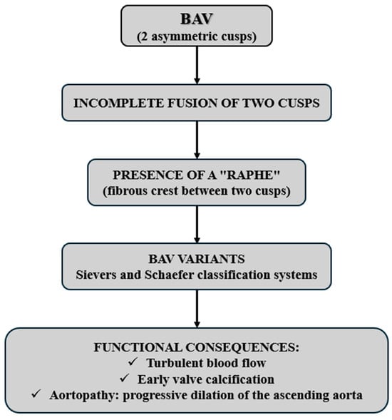 BAV is one of the most prevalent congenital heart diseases in the general population, exhibiting a higher incidence in males [1,5]. In a healthy heart, the aortic valve comprises three cusps. However, in individuals with BAV, the valve consists of only two cusps, leading to significant functional and haemodynamic alterations that may compromise cardiovascular health over time [46].