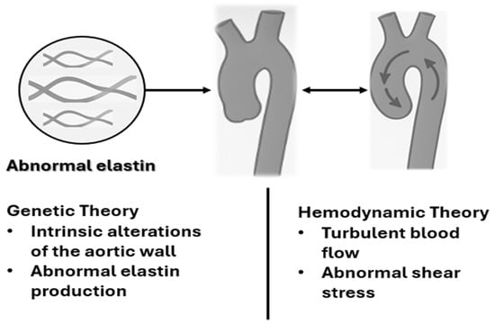 The first is the genetic theory, which suggests that aortic dilation results from intrinsic alterations of the aortic wall, associated with structural defects in the extracellular matrix. These defects lead to abnormal elastin production, a protein essential for the resistance and elasticity of blood vessels. In particular, the lack of elastin compromises the ability of the aortic wall to respond adequately to pressure changes, thus promoting the progressive dilation of the vessel (Figure 3).