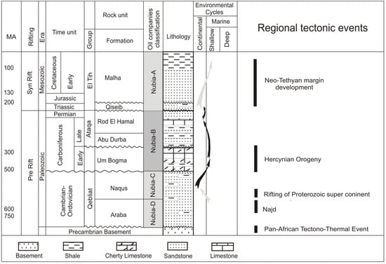 Generalized tectonic and lithostratigraphic column in the Gulf of Suez illustrating the Nubia Sandstone, Egypt (changed from [4,5,6,7,8,9,10,11]). The arrows refer to the environmental cycles.