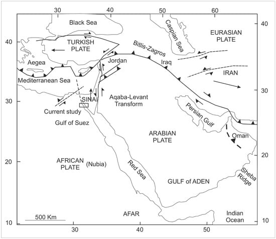 Simplified tectonic setting map showing the location of the Gulf of Suez, Middle East, with an illustration of plate motions (changed from [4,5]).