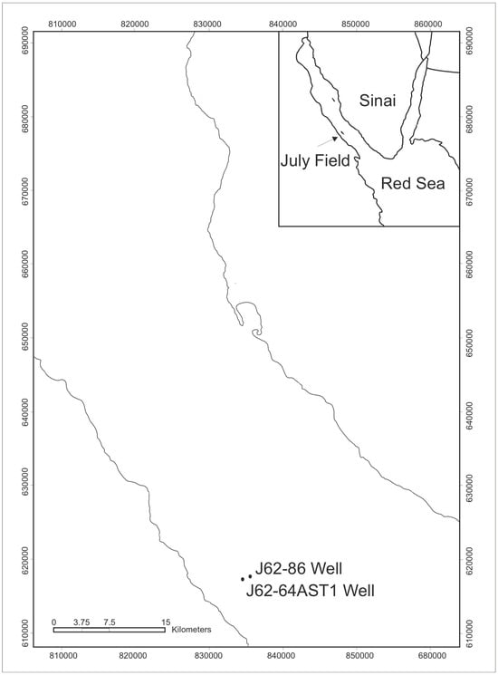 The Gulf of Suez is located between the African and Arabian tectonic plates (Figure 2); it has been studied for oil and gas exploration [28]. The contemporary Gulf of Suez rift, along with the Red Sea oceanic basin and the Aqaba–Dead Sea transform systems, constitutes the Sinai triple junction (Figure 3), which originated during the northeastward displacement of the Arabian plate from the African plate [9]. The Gulf of Suez represents a large graben/half graben assemblage situated between two basement uplifts—the Sinai and the Eastern Desert mountain ranges [10]. The Palaeozoic–Lower Cretaceous Nubian Sandstone consists of a substantial sequence of clastic and thin carbonate sediments, reaching depths of up to 1200 m [11]. The subsurface strata in the Gulf of Suez are recognized as the Nubia Sandstones [11]. The July Field (Figure 3) is regarded as one of the principal oil fields in the Gulf of Suez, Egypt [29]. The Nubia Sandstone exhibits thick stratifications ranging from the Palaeozoic to the Mesozoic and is positioned unconformably on the top of the Precambrian basement complex; this formation is distributed throughout the Gulf of Suez with variable thicknesses, with these strata being exposed along the western and eastern margins of the Gulf of Suez [9]. The characteristics of the Nubia Sandstone are consistent and situated in proximity to the northern boundary of the African craton [30].