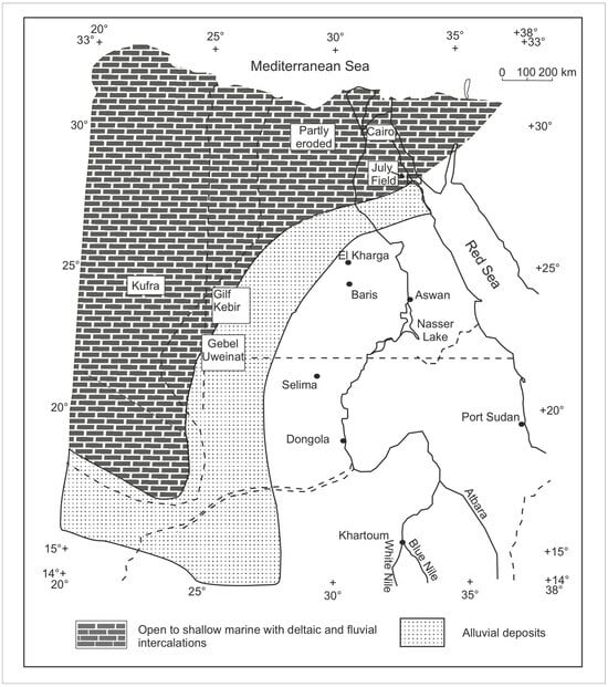 The Palaeozoic rocks exposed in the Um Bogma area in the Southwestern Sinai have been discussed in [23]. The correlation between the surface and subsurface Palaeozoic complex is illustrated in (Figure 1). The Ataqa Group (Figure 1) was used to describe different sections in Central Sinai boreholes and in the Eastern Desert [15]. The Ataqa Group is underlain by the Qebliat Group (Figure 1), and these units are dominantly clastic and were proposed to belong to the Cambro-Ordovician based on their trace fossil contents [23]. The interval between the Cambrian and Carboniferous strata (Figure 1) is poorly dated, and this unit was named Nubia “C” [15]. This unit of Nubia “C” is well represented in the July Field of the current study, and it was proposed to be of the Ordovician, Silurian, and Devonian age [15]. In Southwestern Egypt and Northwestern Sudan, the Devonian is not dated palaeontologically. However, part of the strata overlying the Silurian beds at Gebel Tageru, east and southeast of Gebel Kissu, and at Gebel Uweinat (Figure 4) were proposed to be of the Devonian age [30], while in northwestern Egypt, there were some palynomorphs reported to be of Late Emsian to Early Givetian age [26].