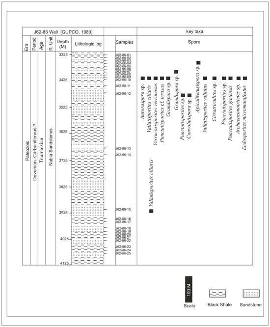 Dispersed spore assemblages occur only in some restricted intervals and not in the whole profile (Figure 3 and Figure 4). The most productive samples in J62-64 AST1 well were at depths [3500, 3525, and 3530 m] of samples [8,10,12]. The productive interval in J62-86 well is [3425, and 3450] of samples [9,10]. Zonate and camerate spores, microgranulate and verrucate spores of the genus Verrucosisporites (Ibrahim) Smith and Butterworth, and spores of the genus Hymenozonotriletes Naumova dominated. Moreover, some megaspores were observed in the genus. Abundant are plant fragments, tracheids, pseudocellular cuticles, cuticles of arthropods, and tubular fragments. Sculptured spores of the genus Apiculiretusispora (Streel) Streel laevigate and patinate Archaeozonotriletes (Naumova) Allen, crassitate forms including Aneurospora (Streel) Richardson et al., and ornamented patinate spores (e.g., Cymbosporites Allen) are rare. The spore assemblage is characterized mainly by spores of genera Apiculatisporites (Ibrahim) Potonié and Kremp, Convolutispora Hoffmeister et al., Densosporites (Berry) Butterworth et al., Geminospora (Balme) Playford, Grandispora Hoffmeister, Staplin and Malloy, Punctatisporites Ibrahim, Pustulatisporites Potonié and Kremp Rhabdosporites Richardson, Samarisporites Richardson, Spelaeotriletes Neves and Owens, Vallatisporites (Hacquebard) Sullivan, Chelinospora Allen, and Synorisporites Richardson and Lister, some Reticulatisporites Ibrahim, and several representatives of Leiosphaerida Eisenack, Lophosphaeridium Timofeev, Schizocystia bicornuta Jardiné, and fragments of filamentous green algae.
