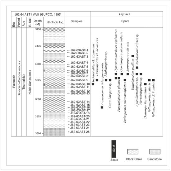 Lithologic log and chronostratigraphic framework of the J62-64 AST1 well, Gulf of Suez, Egypt (log based on [32]), with key taxa. The arrows refer to the location of the studied samples.