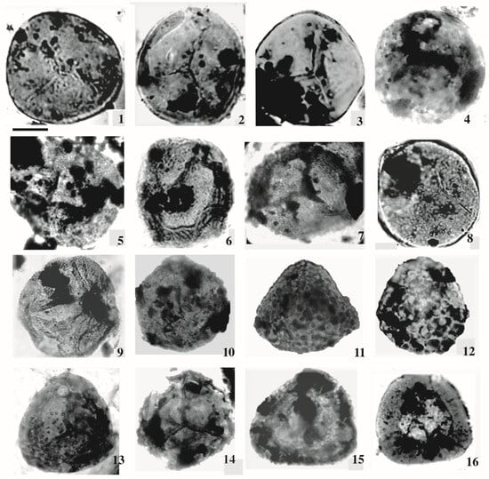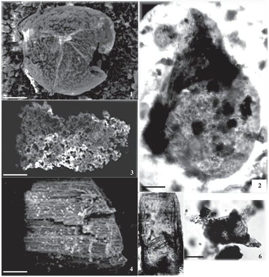 - El Atfy, H.; Bek, J.; Hosny, A.M.; Uhl, D. The Carboniferous spore genus Vestispora: New palynological insights from Gondwana. Rev. Palaeobot. Palynol. 2024, 331, 105207. [Google Scholar] [CrossRef]