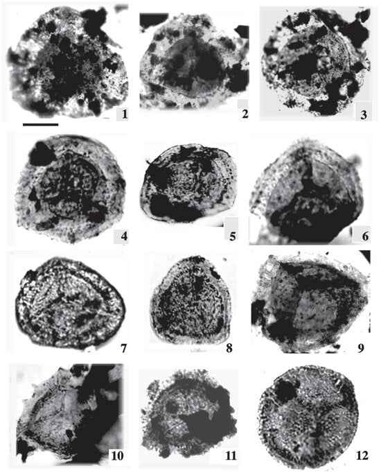 1. Auroraspora solisorta Hoffmeister, Staplin and Malloy; J62-64 AST1-08-6 and J1-08-A1: EF. C20/2. 2. Indotriradites cf. explanatus (Luber) Playford; J62-64 AST1-010-A: EF. F51. 3. Auroraspora sp.; J62-86-010-1. EF. F51. 4. Rhabdosporites sp.: J62-86-09-B-6: P39/4 and J2-020-L1: EF. X1. 5. Vallatisporites sp.; J62-86-09-D1-1. 6. Vallatisporites sp.; J62-86-09-B-6: EF. E34. 7. Geminospora cf. lemurata; J62-86-09-E-2: EF. J51/4. 8. Geminospora sp.; J62-86-09-5: EF. C60-4. 9. Vallatisporites cf. pusillites. 10. Ancyrospora sp.; J62-64 AST1-012. 11. Cirratriradites sp.; J62-86-09-A-9: EF. B36. 12. Archaeozonotriletes cf. famenensis Naumova; J62-86-016-1. Scale bar = 10 μm. The samples in our study were obtained from the deepest wells in the Gulf of Suez, which were significantly influenced by the reservoir rock, leading to poor preservation despite multiple extraction attempts. To improve quality, we remacerated some samples and captured new photomicrographs, which were incorporated into the manuscript.