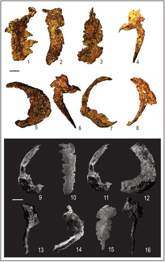 The drilling process caused unidentified conodont assemblage from 1 to 7. Photomicrographs of conodont fragments: 8–16. Conodont fragments: 1–7 (Scale bar 400 μm).